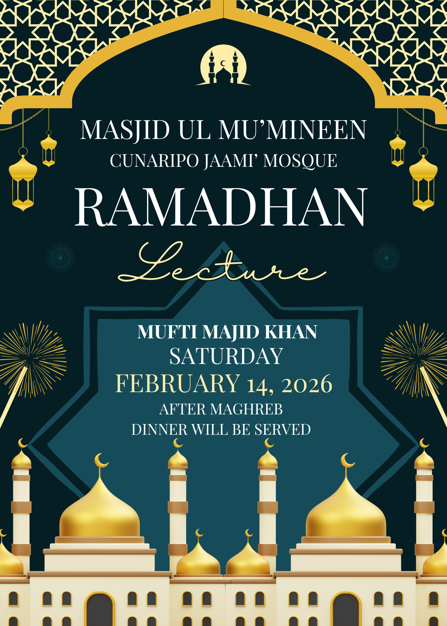 Masjid ul Mu’minineen, Cunaripo Jaami’ Mosque warmly invites you to a Pre-Ramadhan 1447 lecture by Mufti Majid Khan.